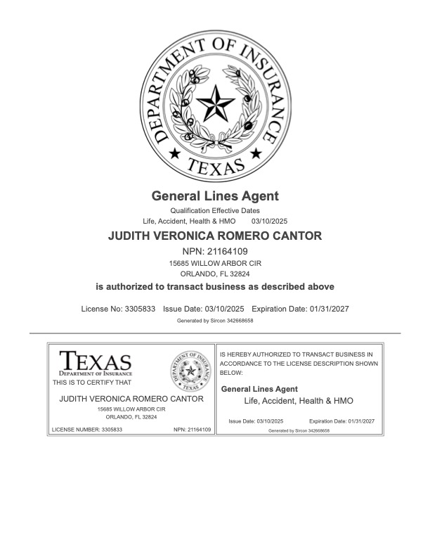 Soy un agente de seguros licenciado en más de 10 estados de los Estados Unidos, cumpliendo con todos los requisitos y regulaciones tanto a nivel estatal como federal.